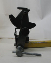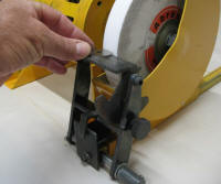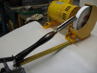 With the toolrest swung down out of the way, the pivot cup is available for my straight ground gouges and my fingernail/long grind jig. I have scribed marks along the length of the sliding bar for each grind. This is a very quick set up to sharpen the spindle roughing gouge. | |