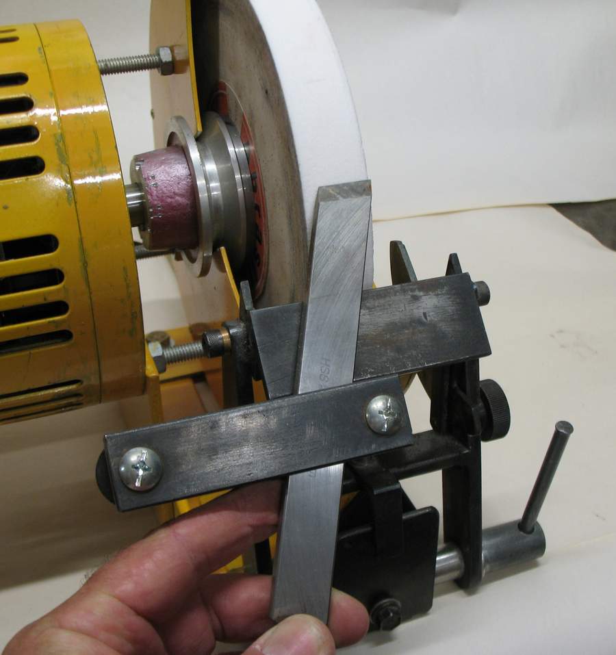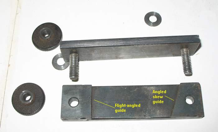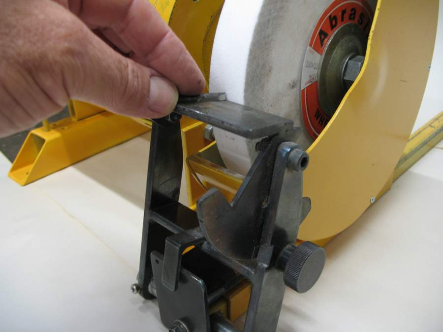 In use, the edge of the jig slides along the front face of the toolrest and both sides of the skew are sharpened without having to move the jig. The same setup could be used on any stable toolrest with it's front edge parallel to the wheel surface.I generally hone the edge of the skew on a diamond file between grinds - usually honing as many times as it takes before the two ends of the concave grind on the bevel blend together. |
