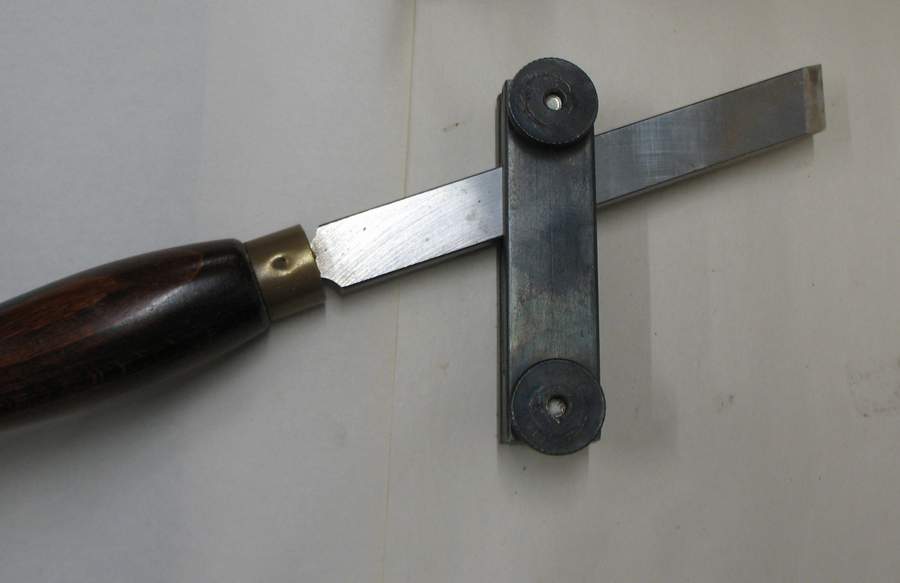 The other setting on the toolrest is a very low angle to suit my very standard Skew chisel. The guide-jig is simply slipped over the end of the chisel, set to the right position with the depth stop and the thumbwheels tightened. |