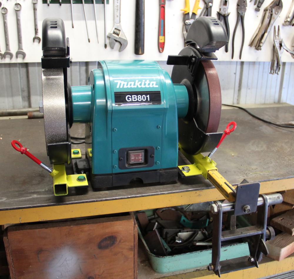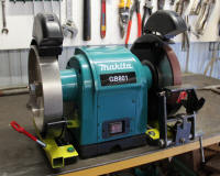 Modern technology has made the compound abrasive wheel as good as obsolete so I've joined the 21st century with a diamond wheel for sharpening my carbide cutters and putting a fine finish on the tool edges and a CBN wheel for shaping and touching up my HSS turning tools. No more mucking about truing-up, balancing, cleaning or worrying about high speed missiles for this little black duck!Made an extra jig holder so now I can use all my jigs on either wheel and never have to compensate for wheel reduction - paradise! |