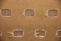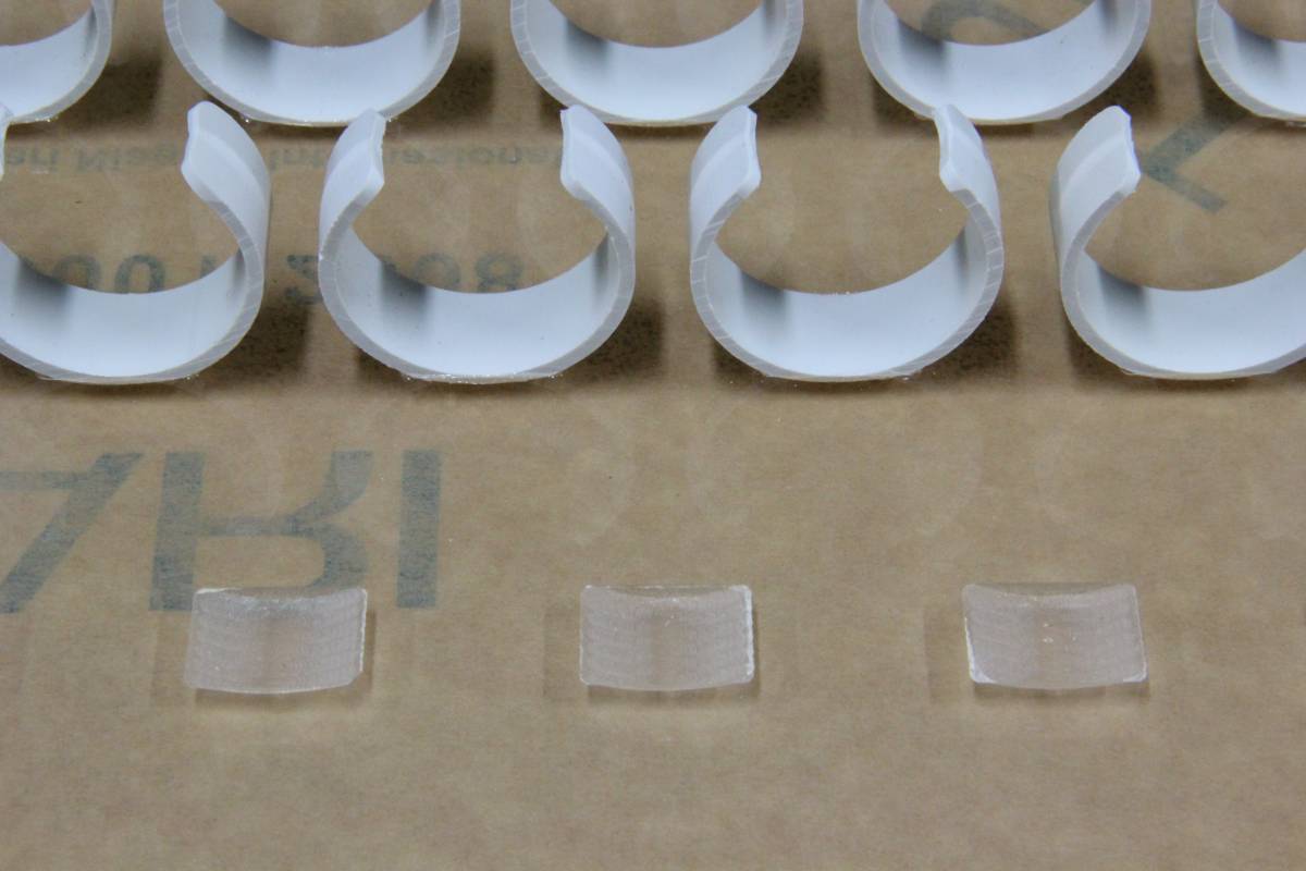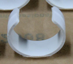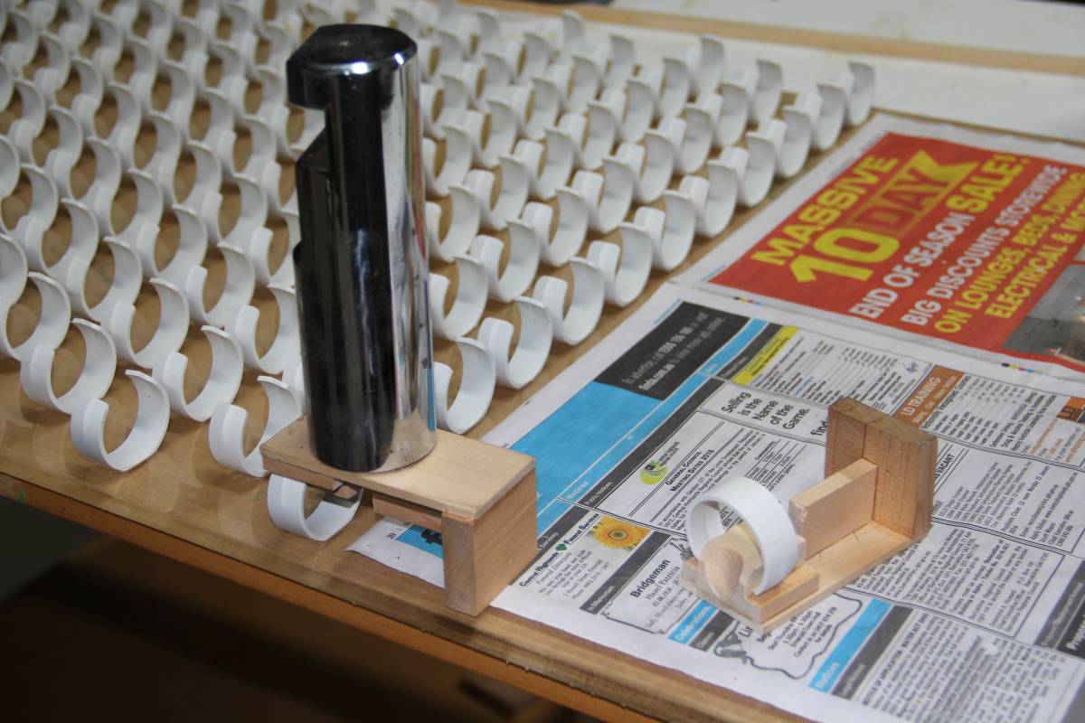 I made the pictured wooden jigs to align the opening of each clip correctly and apply a bit of pressure with a solid steel billet while the PVC cement did it's thing. Having two of the jigs was essential so that I could glue one clip in place and apply the weight, then glue the next clip in place and transfer the weight to it, and so on. . . . . . 1012 times!!!!! - I wasn't cut out for repetitive jobs! | |