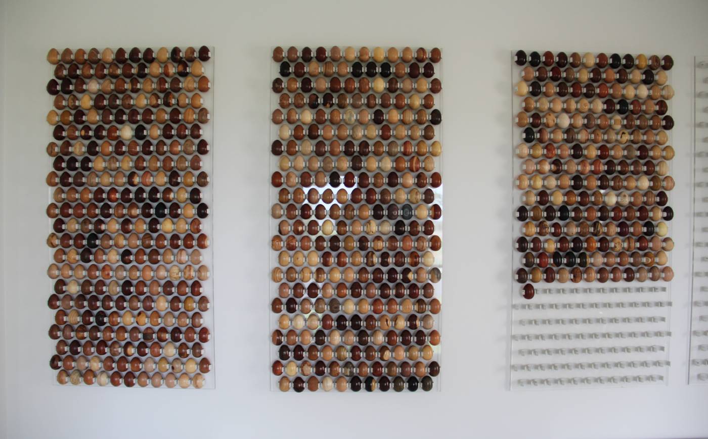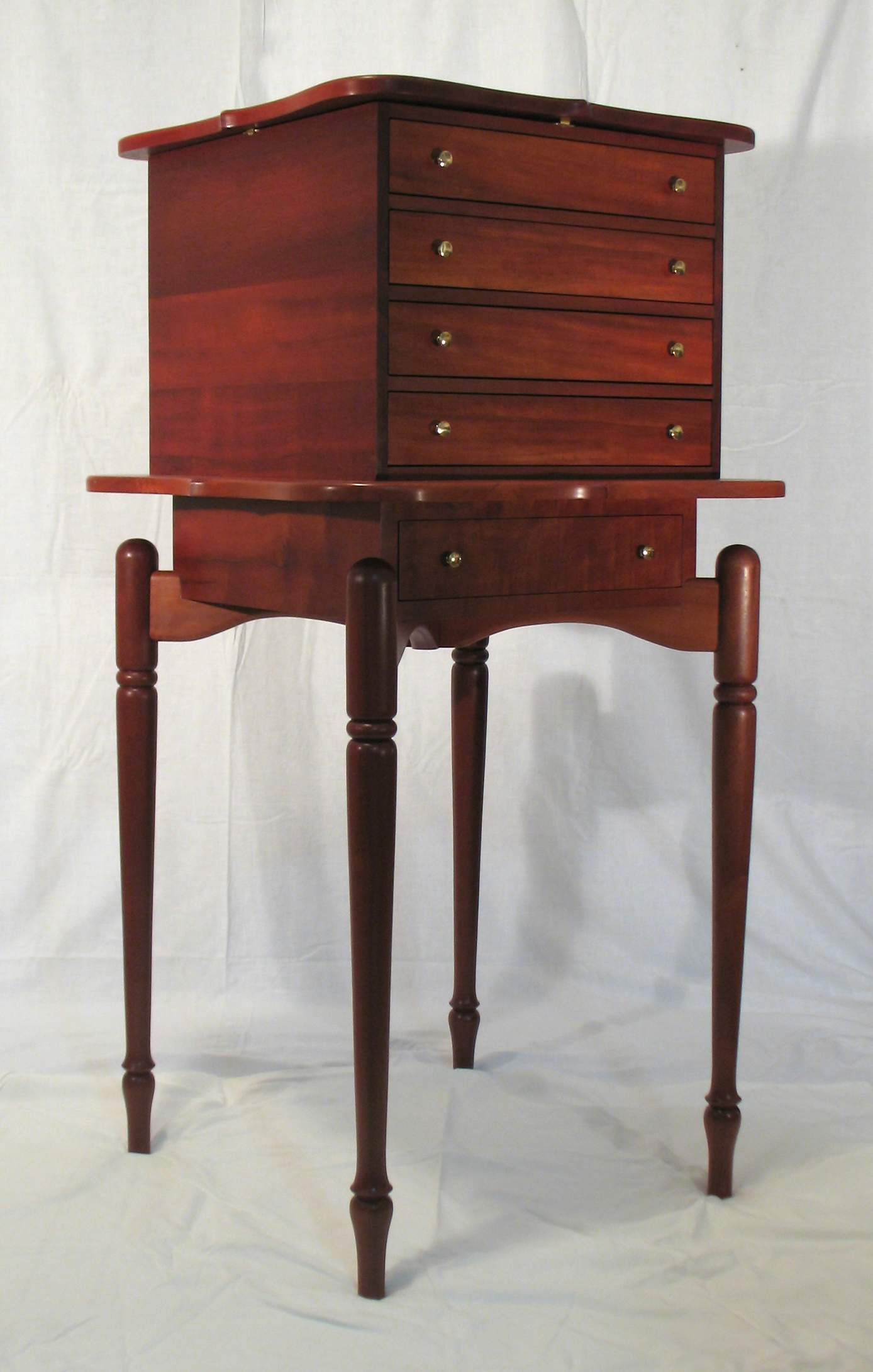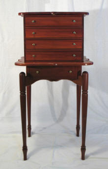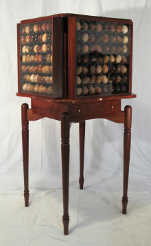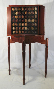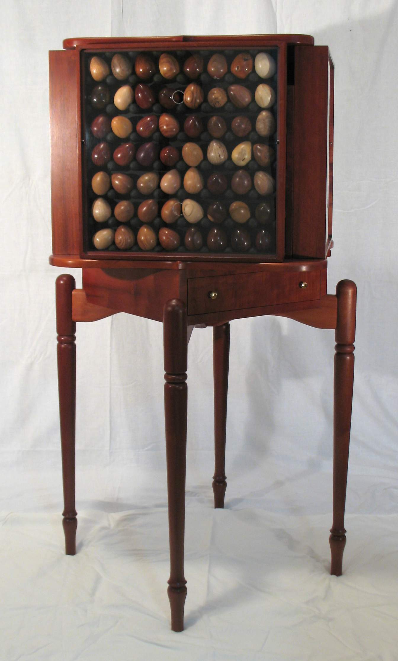 In 'display' mode, the top is lifted off and the drawers removed and stood on their faces around the cabinet. The top is then placed back on to lock it all together. The whole top section sits on a bearing allowing it to rotate like a jewellery case and can be lifted off the stand to be used independently on a table or bench if required. Sounds easy but with over 200 eggs in there it's a lot heavier than it looks!
