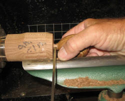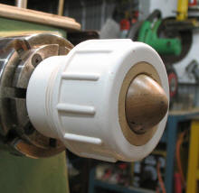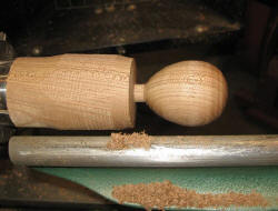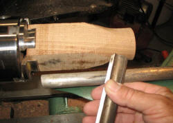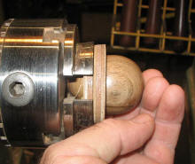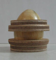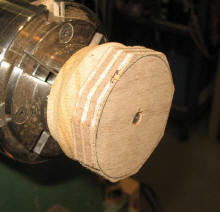 Shape the disk to fit snugly inside the base of your egg-chuck. If you take too much off, a layer of masking tape will take up the slack - it's not that crucial but you do want it tight enough to stay in place while the seat for the egg is cut. | |
