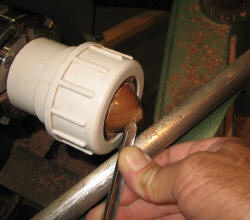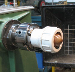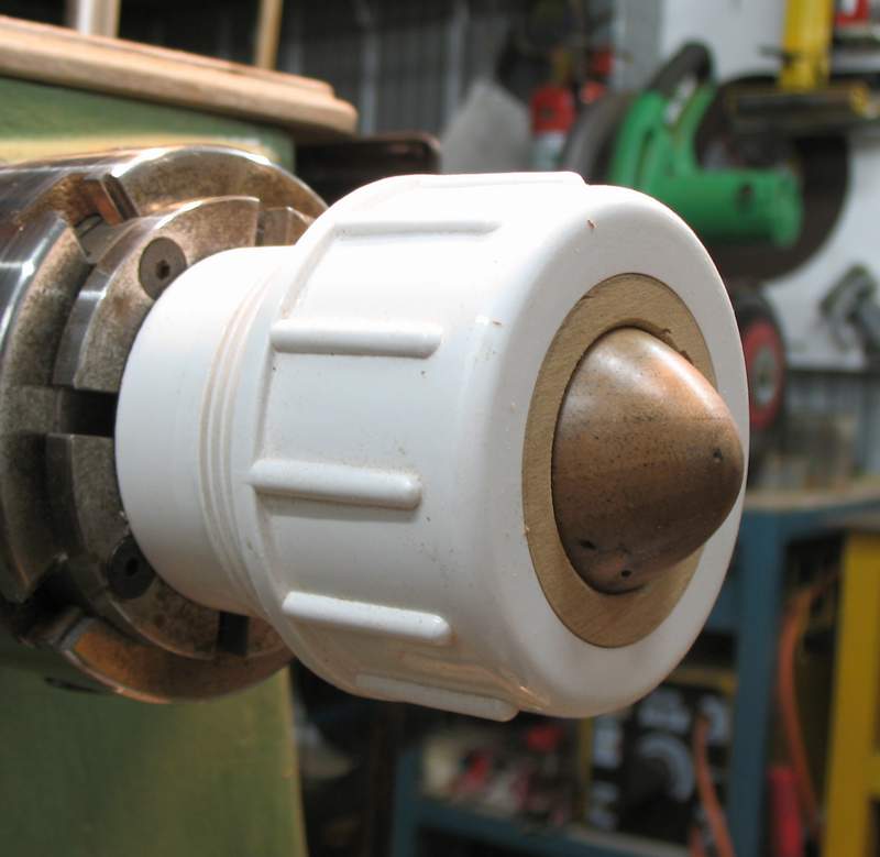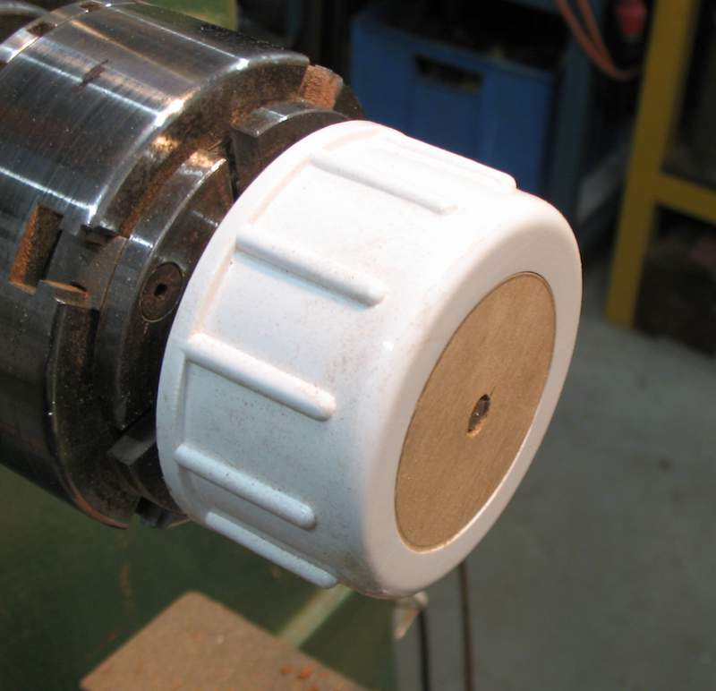 Cut 2 disks of scrap timber just bigger than the largest inner diameter of the PVC fittings. I use ply for strength in all directions but any scrap will do. Drill the centre of the disk and mount it on a screw-chuck with a scrap timber spacer behind it to keep your tools away from the chuck. | |
