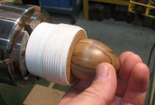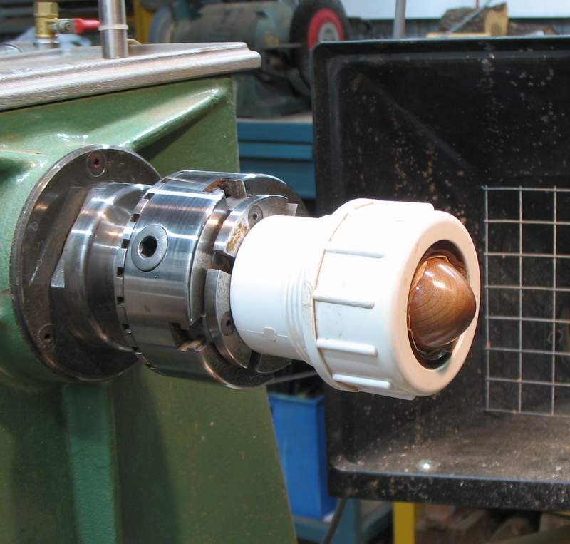 To finish the parted end of the first couple of eggs I made, I just sanded and hand finished to remove the stub but I decided this wasn't good enough as I wanted fully polished eggs with no sign of how they were produced. A few simple modifications to a PVC pipe fitting produced a simple chuck to hold the eggs which are loosely sized on a standard XL chooks egg.A friend asked me to make them a chuck so here is the step-by-step .... | |