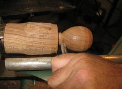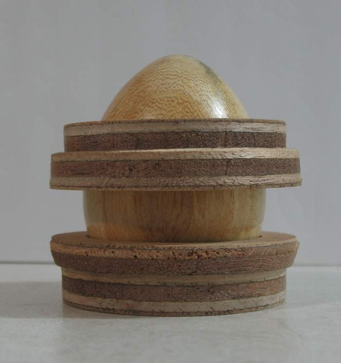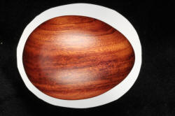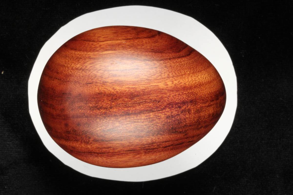 Now is the time to fill cracks or voids if there are any, then sand the egg to remove all tool marks. Experience will tell you what grit to start with but if you're careful with the chisel, you should be able to start at about 240 grit and work your way up. My 'collection' eggs all get the same treatment, regardless of wood type - sanded through the grades to 1000 grit, a rub at speed with Ubeaut EEE polish followed by 2 coats of Ubeaut Shellawax burnished in at high speed. | |
